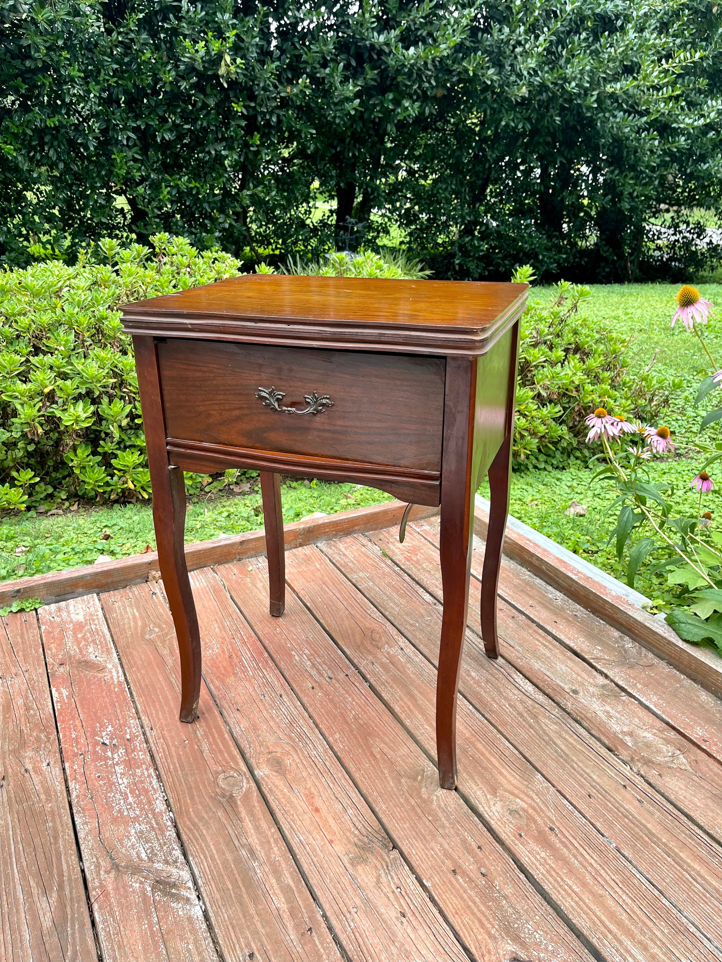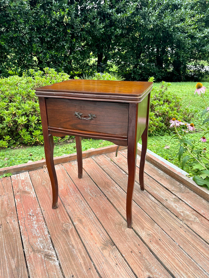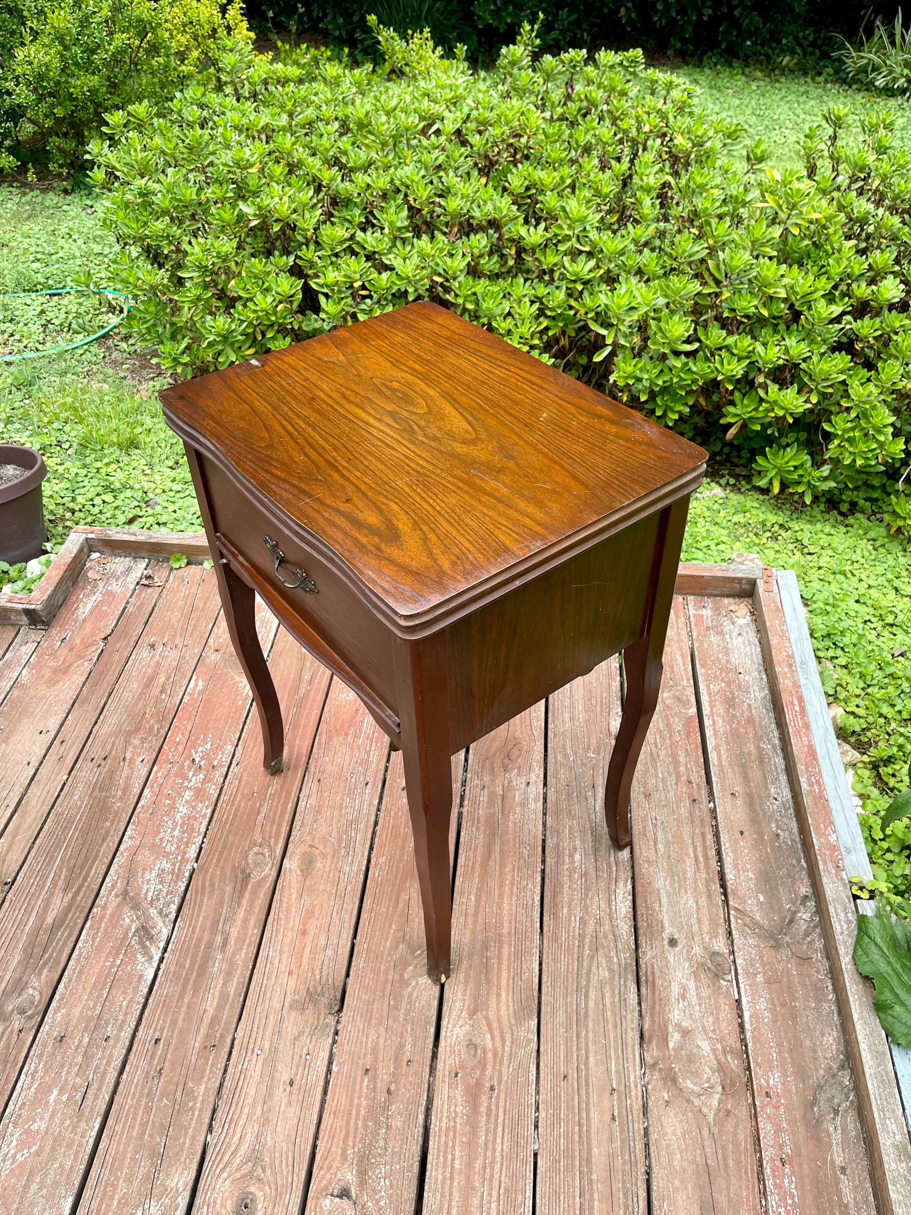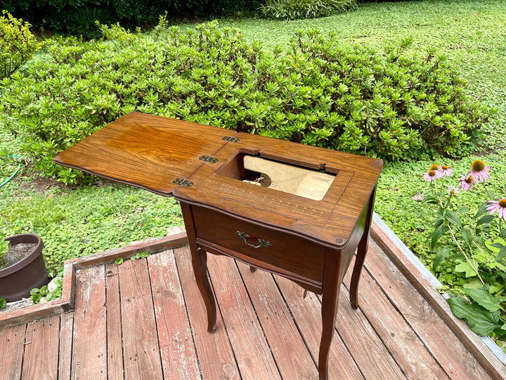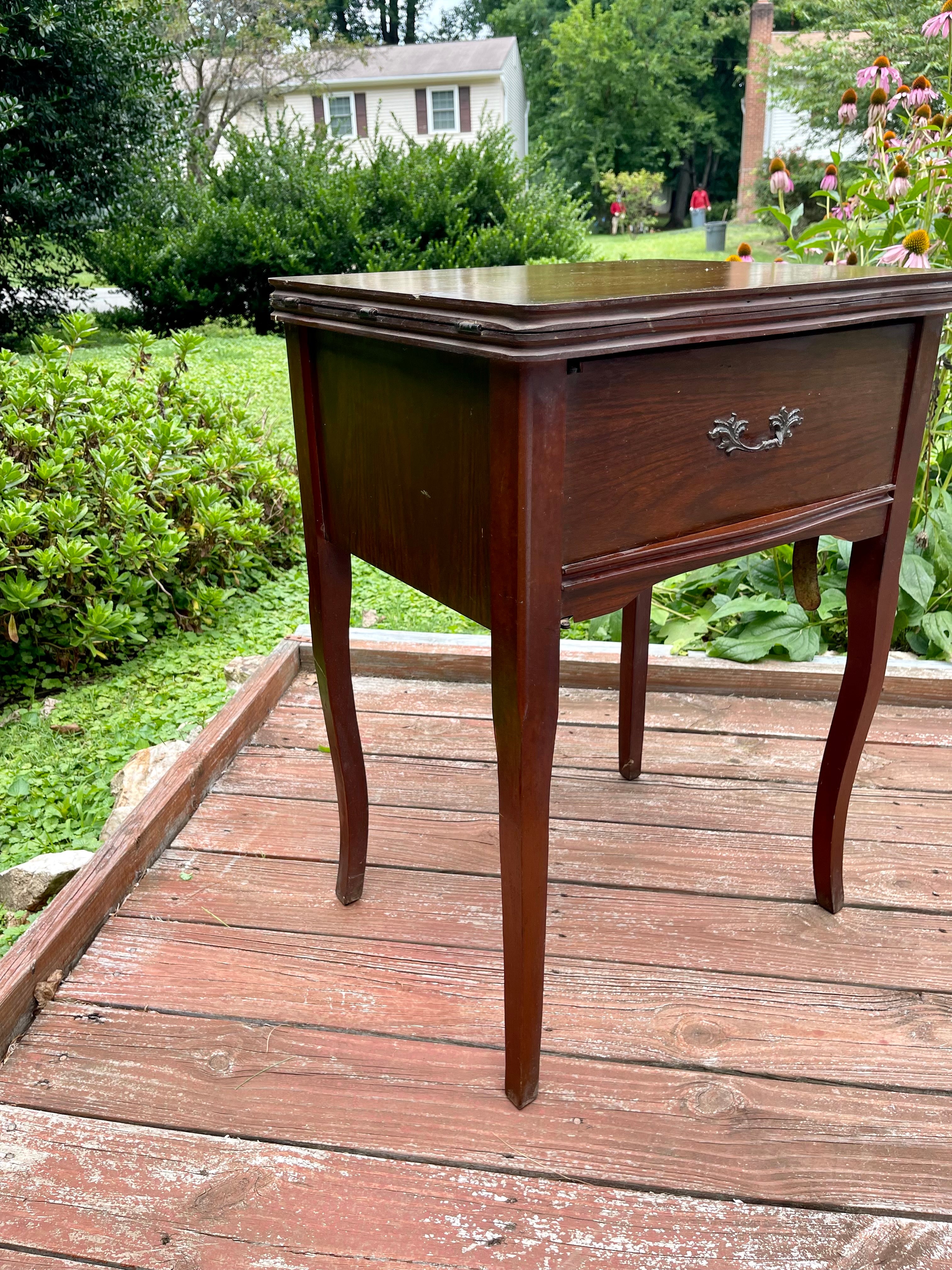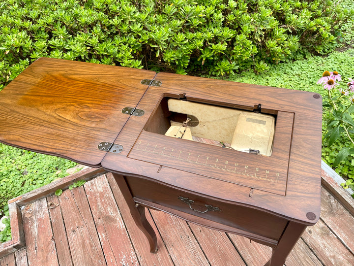Nicely restored vintage sewing table with machine still inside. Machine works fine or can convert it into a nice side table or home bar.