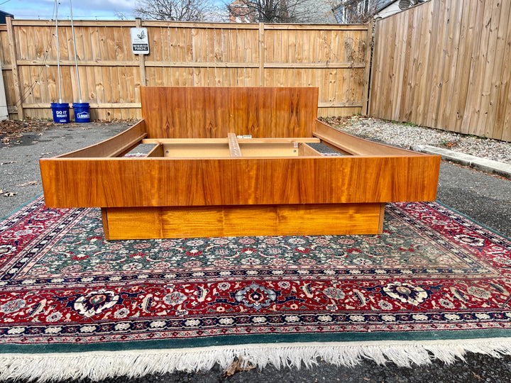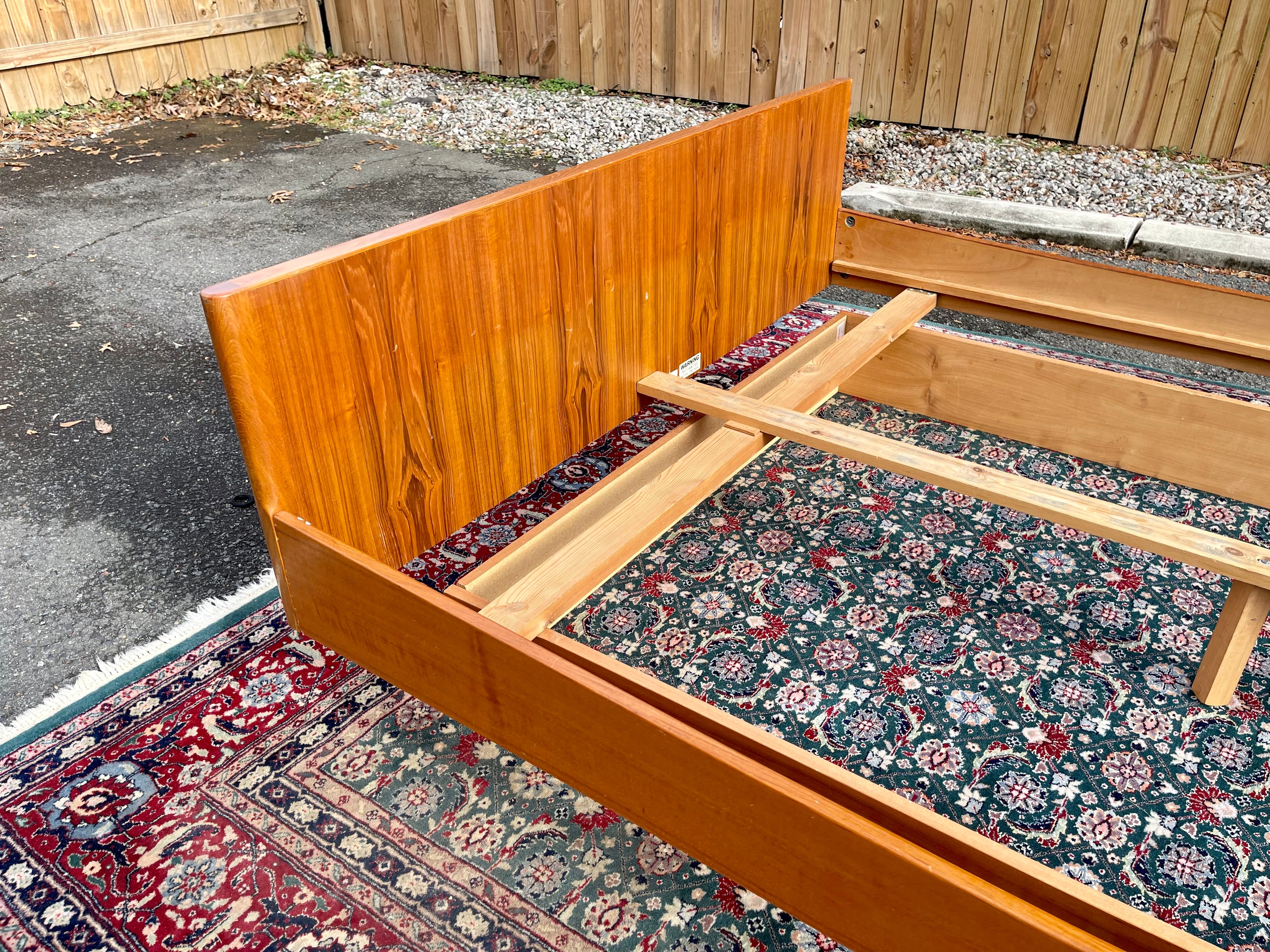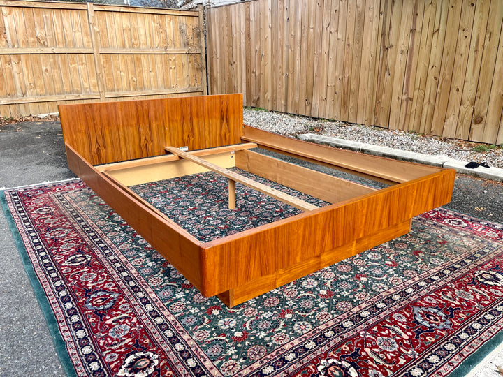 Stunning and rare, this teak bed frame is in great vintage condition and makes the perfect addition to your home. Sleep lines typical of Danish design combined with incredible teak wood grain set this piece apart. The plinth base provides a floating look the the frame that is incredibly unique and modern. Slats included, not pictured. Assembly available with delivery.