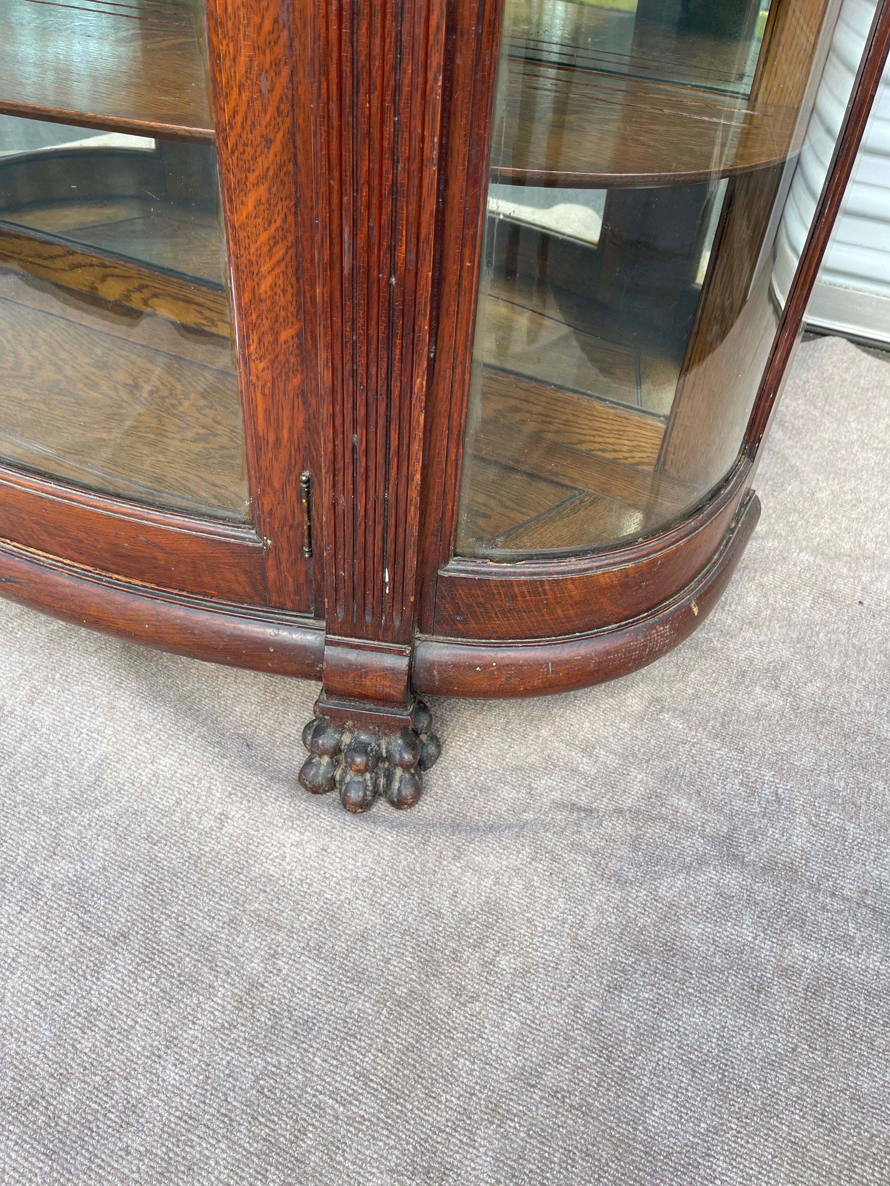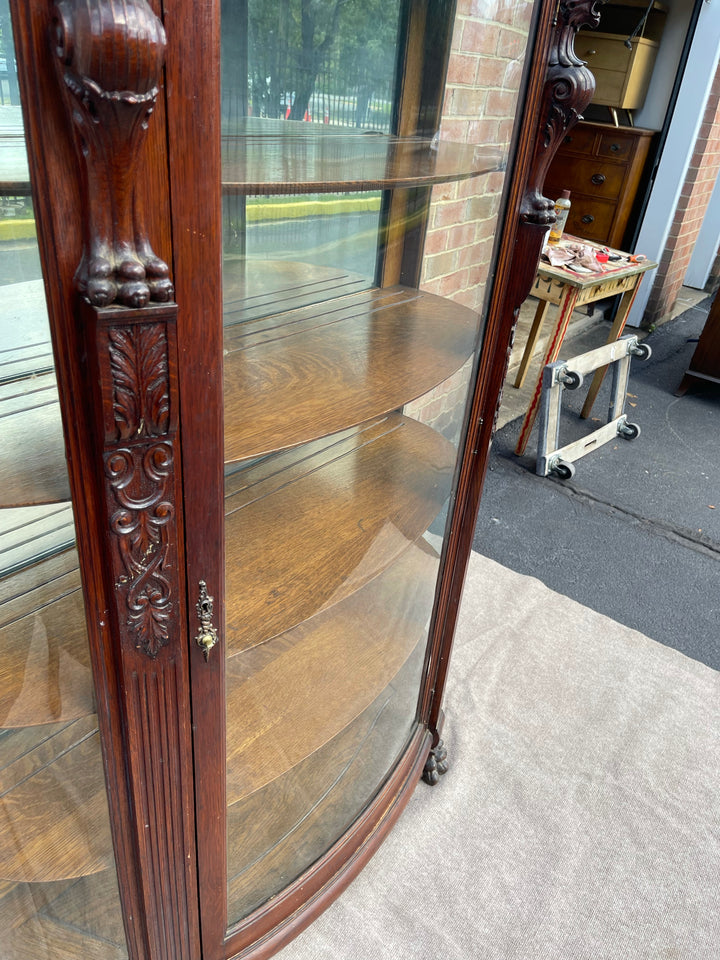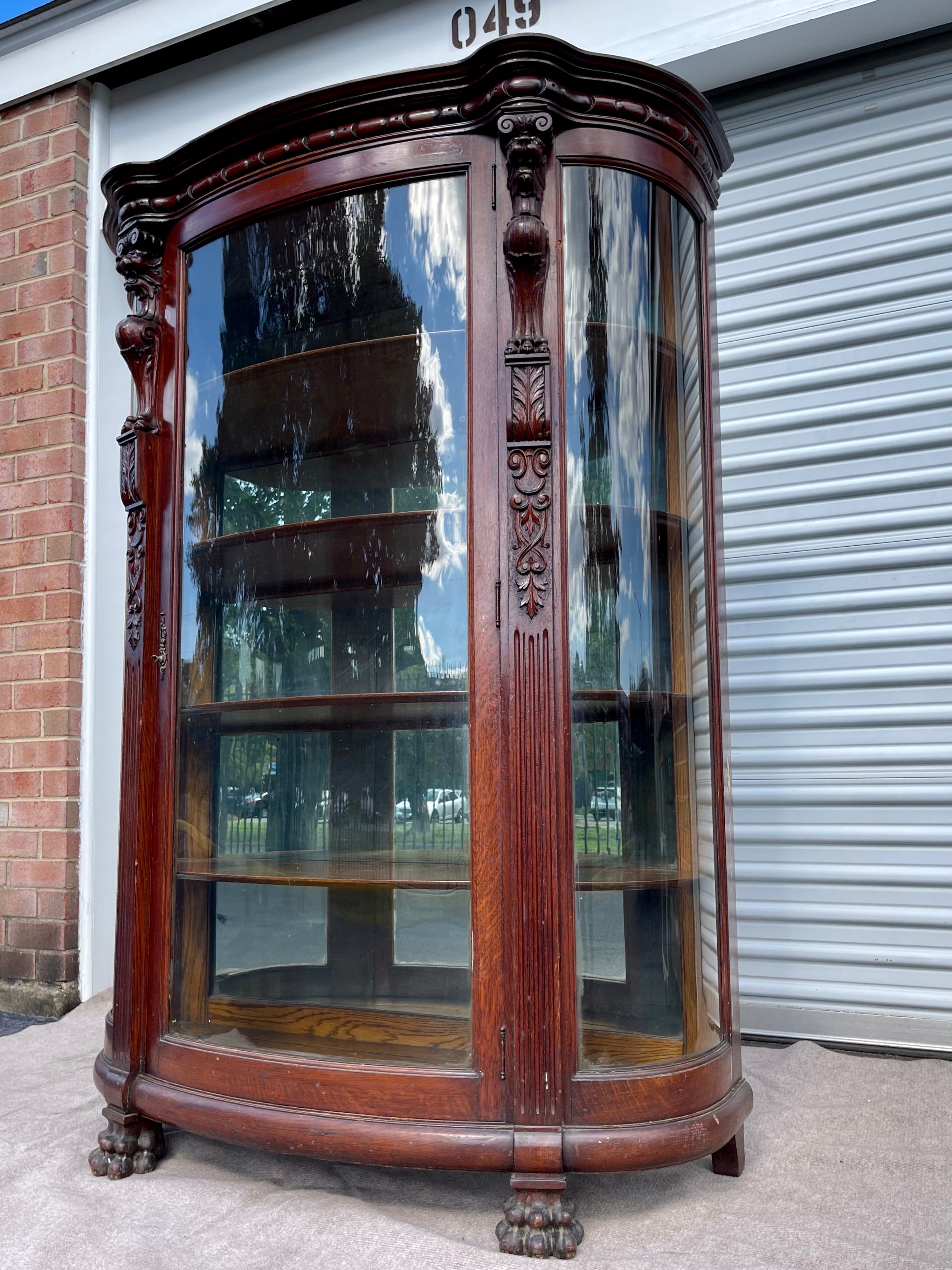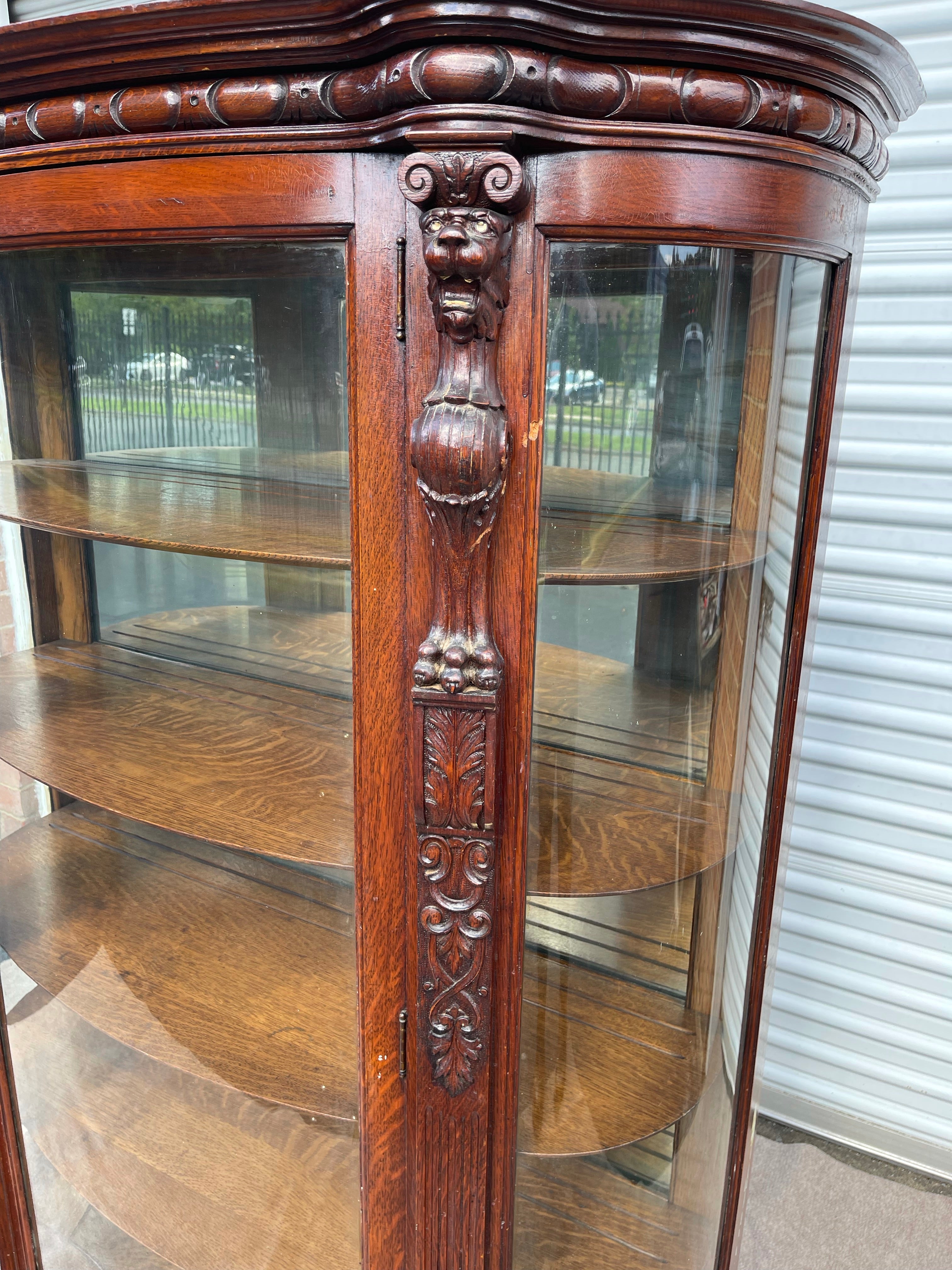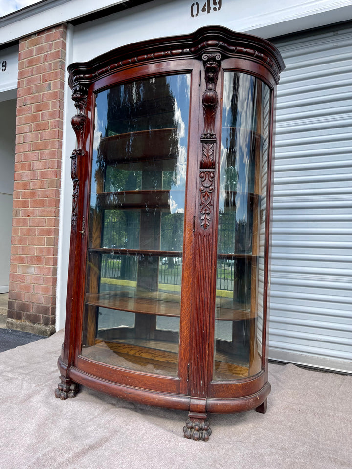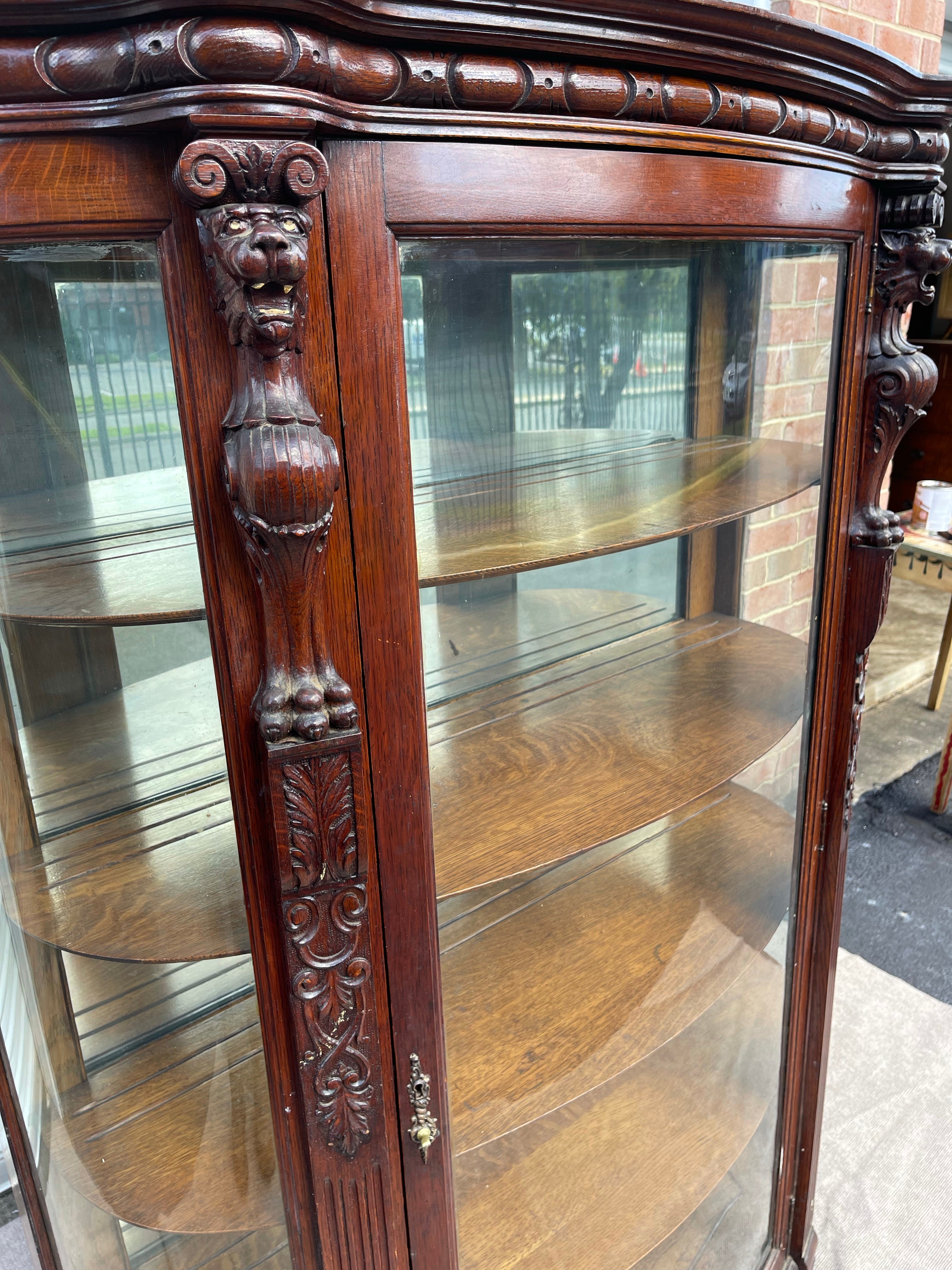 The history and hand carved details are what really set this piece apart, as well as the curved glass front and mirrored back. Really one of a kind.