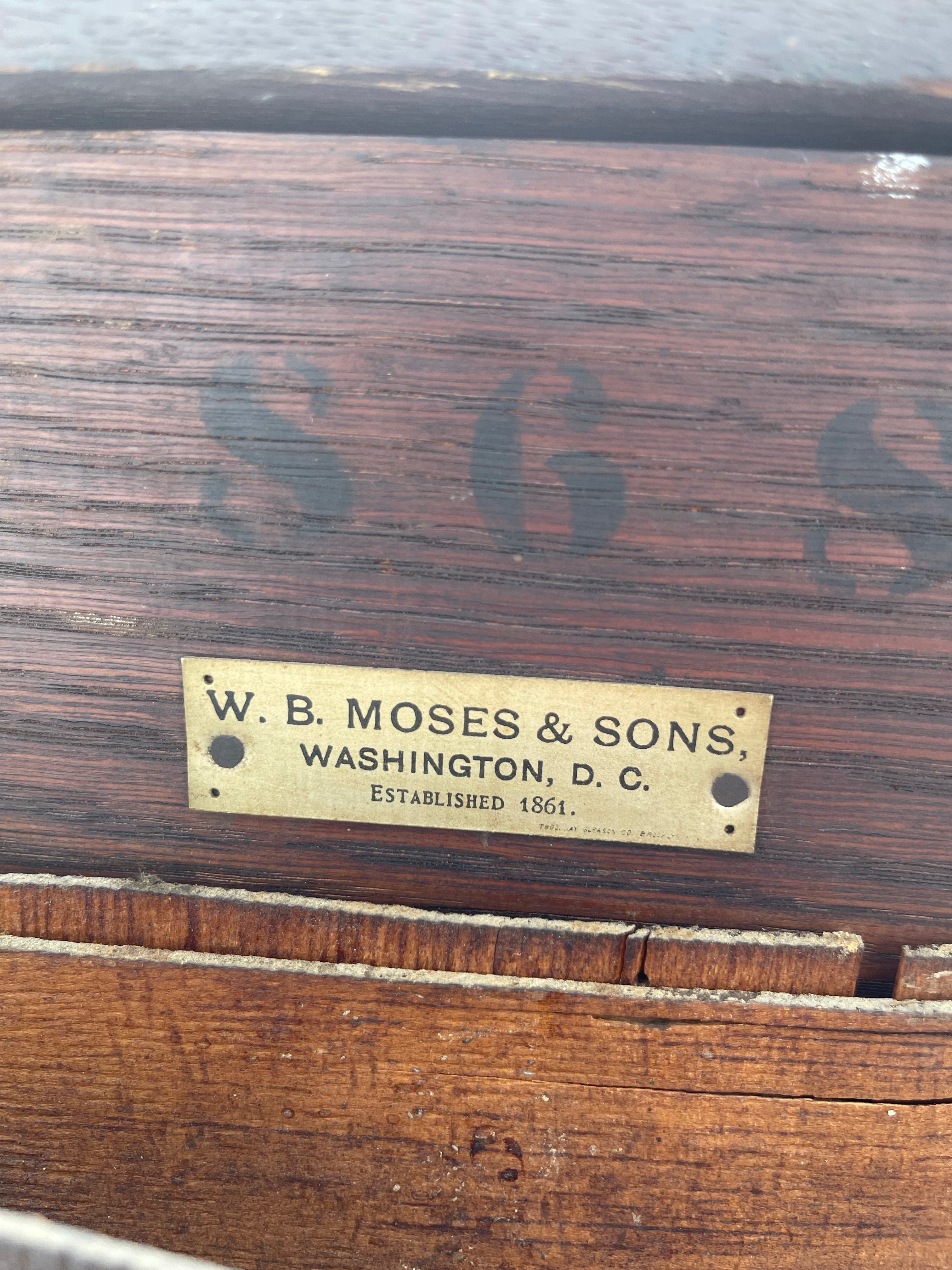 Made by the W.B. Moses & Sons Furniture Company right here in DC! W.B. Moses was the biggest furniture company in the district in 1908, when this piece was made. There is a faint marking on the back glass that says “Mar 1908 Chicago”