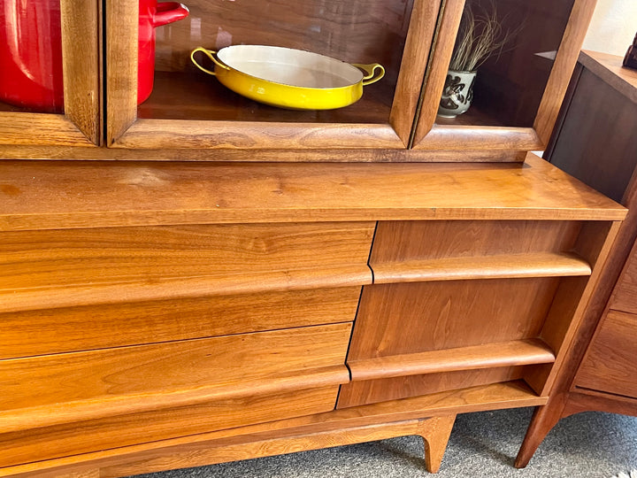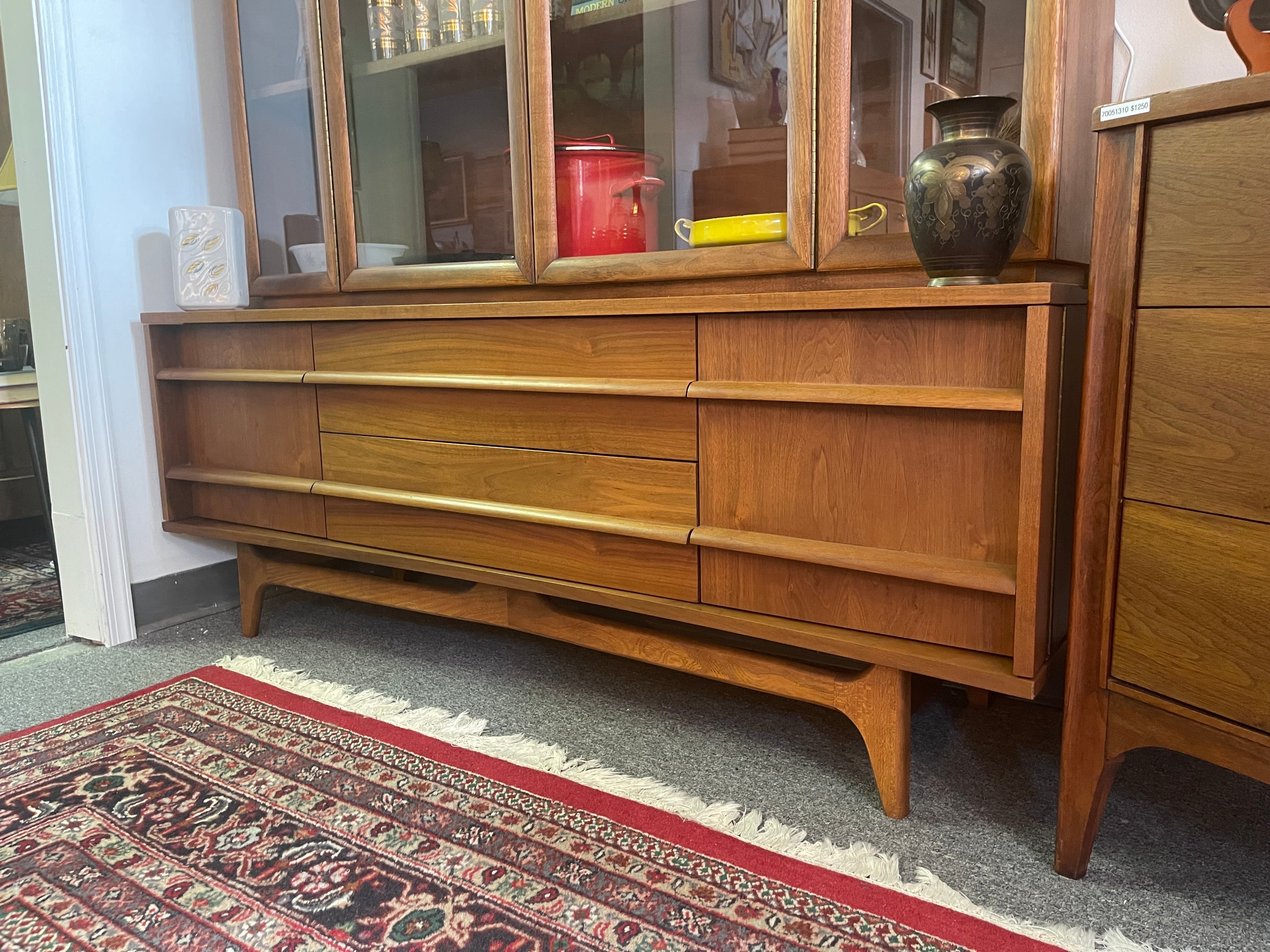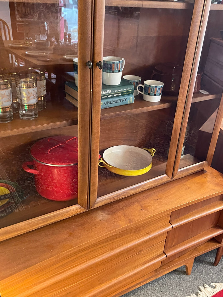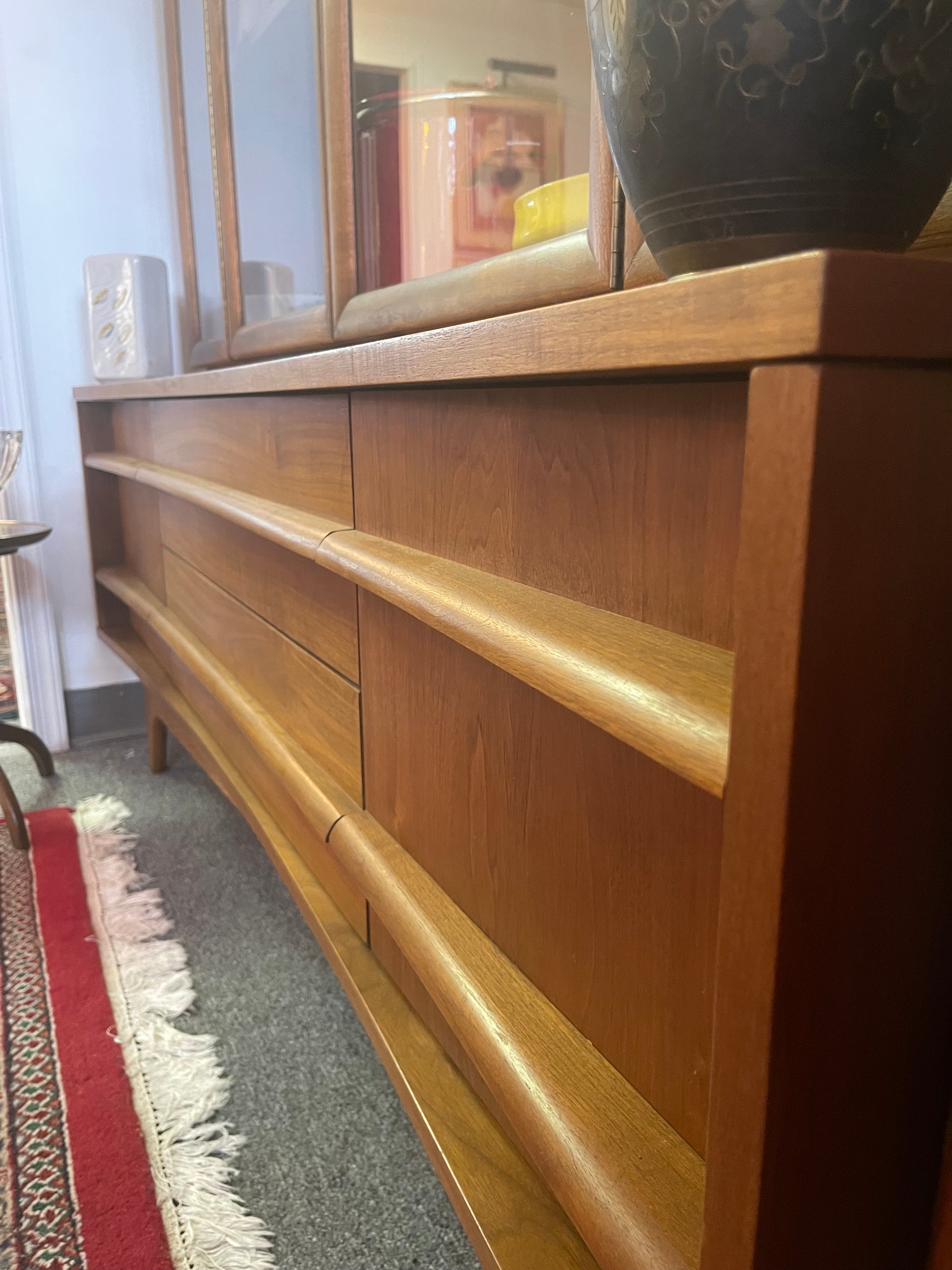One of our favorite pieces of all time, and from our personal collection! Young Mfg makes some of the best quality MCM pieces out there. This bow fronted China cabinet is no exception. The credenza has two cabinets and two spacious drawers, and the hutch speaks for itself. Perfect for vintage glassware and liquor storage, or whatever you’d like to display!
